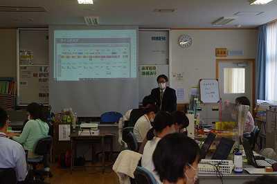 令和4年4月28日(木)、Pepperくんの活用についての職員研修を行いました。市教委から伊東対策監に来ていただいて、導入経緯やどんなことができるのかという説明や、実際に操作しながらの体験研修を行ってもらいました。