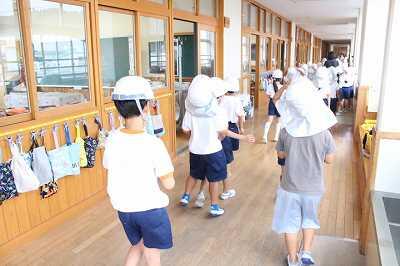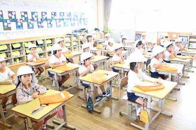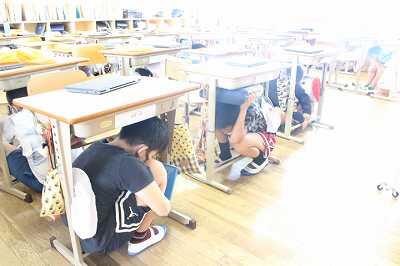 本日、地震が発生し大津波警報が発せられた場合を想定して、全校で避難訓練を行いました。まず、地震発生の放送を聞いて、机の下に身を潜め、頭や体を守りました。次に、雨で運動場がぬかるんでいたので、運動場への避難訓練は見送り、教室で大津波警報を聞いたとの想定で、南校舎の3階に避難しました。最後に、各教室で今日の避難訓練を振り返りました。