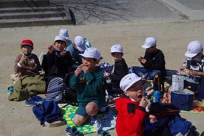 青空の下で、みんなで食べる弁当はおいしそうでした ↓