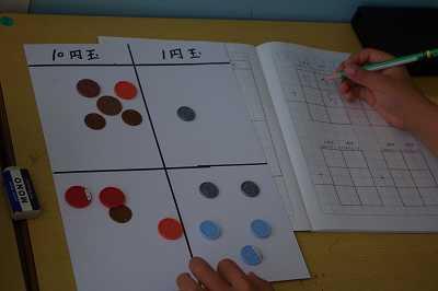 5時間目はのびっこ2の算数の授業。2けた+2けたの筆算の勉強です。お買い物という生活場面を設定し、10円玉や1円玉、レジスターのおもちゃなどを用いて生き生きと学習していました。↓