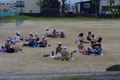 少し雨がぱらついていたので、1~3年生は、早めに帰校し、学校の教室や運動場、中庭でお弁当をおいしそうに食べていました。(写真)