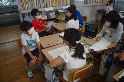 3時間目は、3の1の社会。延岡市の交通がどのように広がっているか調べ理解する学習です。「鉄道」「高速道路」「船」「バス」の4つの班に分かれて調べた子ども達が、その後自分の班に戻り、自分の調べたことを、責任をもって自分の班のメンバーに伝えるという「ジグソー法」という手法を使った学習でした。全員が意欲的に取り組んでいました。↓