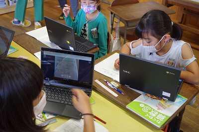 他の友達がサーバー上に送ったノートの画像を使って自分の考えとの違いをチェックしている児童↓