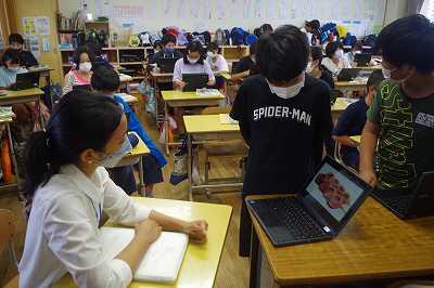 令和4年7月15日(金)午前中、6年教室をのぞいてみると、子どもたちがALTにタブレットで資料を見せながら、一生懸命自分で考えた英語でいろいろ伝えたり、質問に答えたりしていましたよ。