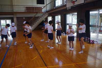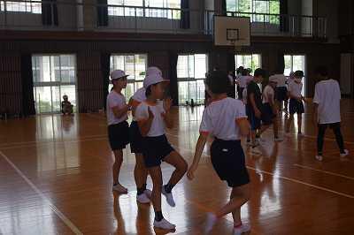 令和4年7月28日(木)、体育館で6年生が5年生に「新新ばんば踊り」を教えていました。運動会で5年生が毎年踊っているようです。6年生も、まだちゃんと覚えていて、上手に教えていました。