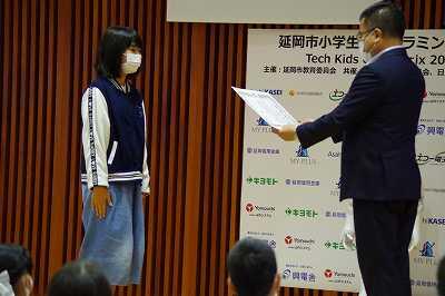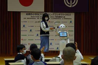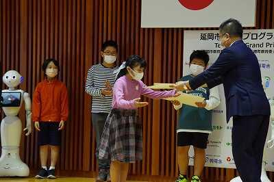 令和4年10月29日(土)、市役所の講堂でペッパープログラミングコンテストの表彰式・発表会がありました。本コンテストには、延岡市、日之影町、高千穂町、五ヶ瀬町の小学生19件(24名)の応募が合ったそうです。旭小からも5年生3名、6年生2名が応募して、全員入賞し、チャレンジ賞2名、グッドチャレンジ賞2名、エクセレントチャレンジ賞1名を受賞しました。エクセレントチャレンジ賞をとった6年生の作品は、19件の中で唯一九州大会にエントリーされるそうです。表彰式は都合で1名参加できませんでしたので、後日校長室で賞状・賞品を授与しました。