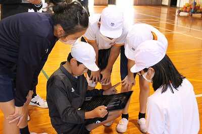 内容は「ソフトバレーボール」です。自分や見方が攻撃しやすいボールをつなぐためのポイントをつかむために、チームで練習したり、タブレットPCで撮影した自分たちの動きを確認して次のゲームに活かしたりするなどしていました。