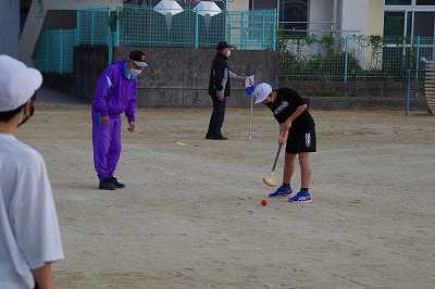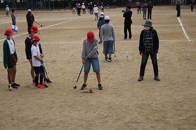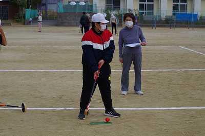 6年生は地域の方々の見守り・サポートでグランドゴルフを楽しみました。↓