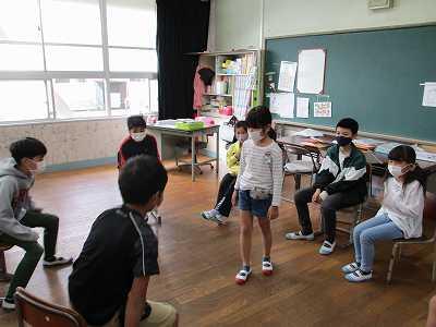 令和4年11月28日(月)、5年生がホスト役になって2年生に英語で説明して英語のゲーム(フルーツバスケットやミステリーボックス、一本橋ゲーム、スイカ割りゲームなど)を楽しんでもらうという取組を行っていました。2年生もとても楽しそうに色やフルーツ、動物、真っ直ぐ歩け、右を向けなどの英語にふれ合っていました。