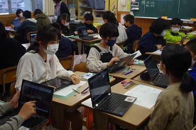 令和4年11月29日(火)、3の3で算数の研究授業がありました。分数の足し算の学習でしたが、ロイロノートの画面共有機能を効果的に活用して、前時の振り返りやグループ・全体学習を行っていました。話し合う時に、相手意識をしっかり持って画面を指で指しながら説明できている児童もいました。