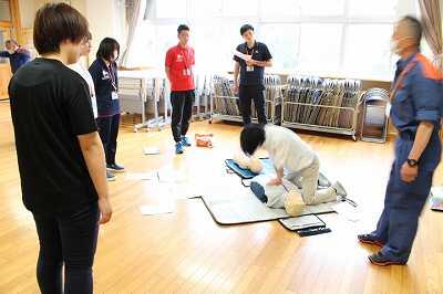 先日、延岡市消防署の方のご指導のもと、職員対象の心肺蘇生法講習会を実施しました。旭小学校では、毎年、この時期にこの講習会を実施し、安全管理意識の高揚や危機対応力の向上を図っています。AEDを使った心肺蘇生法についても学びました。