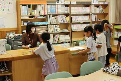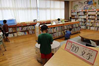 南校舎1階の西側に本校の図書館があります。約9000冊の本があります。子どもたちが、授業中や昼休みに本を読んだり、調べものをしたりしています。今日も、1年生が図書室で本を返したり、読みたい本を借りたりしていました。