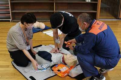 先日、延岡市消防署の方のご指導のもと、職員対象の心肺蘇生法講習会を実施しました。旭小学校では、毎年、この時期にこの講習会を実施し、安全管理意識の高揚や危機対応力の向上を図っています。AEDを使った心肺蘇生法についても学びました。