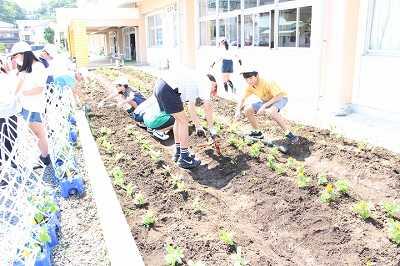 昨日の午後から今日にかけて、梅雨の間の晴れ間を利用して、多くの学級で学級園の花の植え替えをしていました。今回は、夏の花として、ミニひまわりやマリーゴールド、ホウセンカ、サルビア、ニチニチソウなどを植えました。苗は技術員の先生が育ててくださったものです。植え方を担任の先生に教えてもらって、丁寧に植えていました。