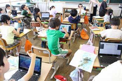 各教室で、タブレットを活用している授業をよく見かけます。国語の漢字や算数の問題(計算や図形など)を解く時間、自分のノートをタブレットで撮影した後みんなで共有して発表したり、先生から送られた写真や動画を見て考えたり、発表資料を作ったり、タイピングの練習をしたり、体育の時間に自分の動きを友達にタブレットで撮影してもらって繰り返し見たり、音楽の時間に・・・、色々な使い方をしています。学習用具の一つとなりつつあります。