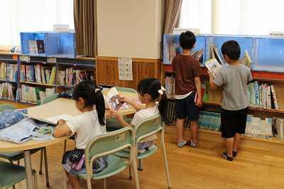 南校舎1階の西側に本校の図書館があります。約9000冊の本があります。子どもたちが、授業中や昼休みに本を読んだり、調べものをしたりしています。今日も、1年生が図書室で本を返したり、読みたい本を借りたりしていました。