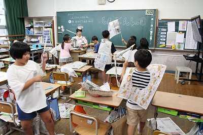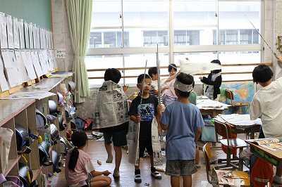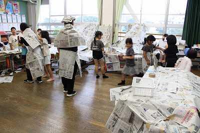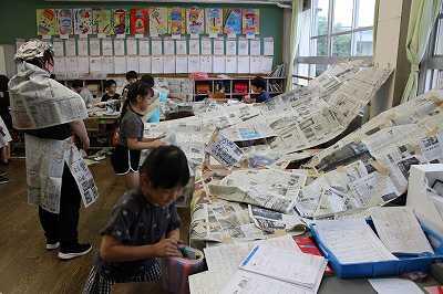 2年生が「新聞となかよし」という工作にチャレンジしました。たくさんの新聞紙を使って、色々なものを自由に使っていました。帽子や洋服、マント、剣、旗、ぬいぐるみ、布団、ベッド、家、秘密基地・・・。楽しそうな声が響いていました。