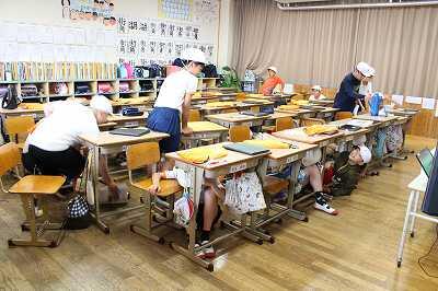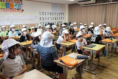 本日、竜巻を想定した非常時訓練を行いました。各学級で、竜巻の恐ろしさや竜巻が来た時に気を付けることなどを勉強しました。次に、実際に竜巻を想定して、「竜巻が来ます」という放送を聞いて、ヘルメットをかぶり、机の下などに隠れる練習をしました。1年生は初めての訓練でした。