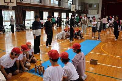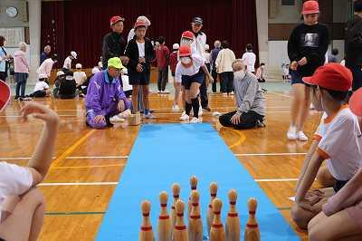 5年生が地域の方々とふれあいグランドゴルフを実施しました。運動場で実施の予定でしたが、あいにくの雨で、体育館でボーリングとグランドゴルフ(体験)をしました。ホールインワンやストライクがたくさん出て、大変盛り上がりました。5年生も地域の方々も笑顔いっぱいでした。