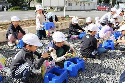 色々な学級が、学級園の花の植え替えをしています。夏~秋に咲いていた花をぬいて、今度は、春に咲く花の苗を植えています。パンジーやビオラ、ノースポールなどです。苗は、学校技術員の先生が種をまき、芽が出たら、ポットに一つ一つ移植して、育ててくださいました。
