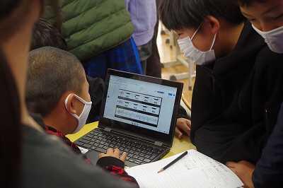 授業の場所が多目的室だったことやたくさんのお客さんが来られていたことなどから、子どもたちはいつもより緊張していたようでしたが、「工夫しながら、小学校生活の思い出を伝え合う」という活動を、途中タブレットをつかって自分の表現を振り返ったりしながらがんばっていました。