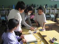 ご協力いただいたのは、延岡市恒富地区高齢者コミュニティセンターで洋裁リフォーム教室福寿草の戸越左代先生とその生徒の方々4名の計5名です。子供たちは、地域の方々に丁寧に教えていただき、とっても分かりやすく、上手に作れたと、喜んでいました。