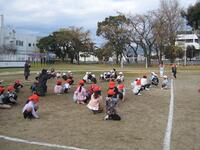 次に、児童全員で赤白を決めることに参加するゲームをしました。赤か白かが記してある封筒を先に選ぶ権利を決めるゲームです。各団で輪をつくり、団長から時計回りにボールを送り、団長に戻ったら、反時計回りにボールを戻し、団長のもとにボールが早く届いた方に封筒を選ぶ権利が与えられるゲームをしました。