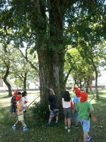 今日は、熱中症指数が厳重警戒レベルとなったため、昼休みは木陰で遊びました。木陰では、セミの抜け殻集めに一生懸命な子や、ミスト周辺で涼む子どもたちがいました。