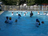 今日で水泳の学習がすべて終了となります。最後の5・6年生の学習は、着衣泳を行いました。服を着た状態で水の中に入ることで服の重さを感じたり、水の中での動きにくさを感じたりしていました。最後は、海や川で流されたときの合い言葉「浮いて待て!」を学習しました。ペットボトルや靴を使って浮く練習を行いました。