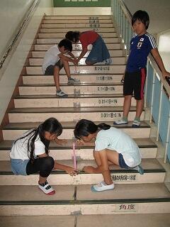 計画委員会は、右側歩行を徹底するため、階段や廊下の中央にテープを貼っておりました。