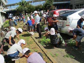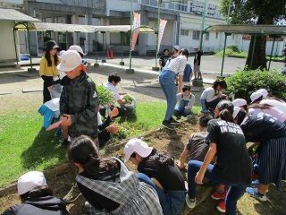 10月10日(木)掃除時間、フラワータイムとして学級園の整備を行いました。これまで学校を彩ってくれた夏の花々を、惜しみながらも抜き取っていきました。