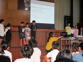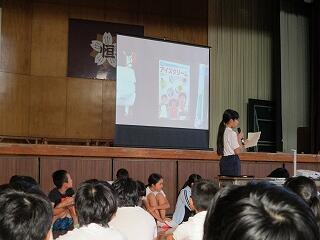 10月15日(金)朝、全校集会が行われ、環境委員会と図書委員会が発表を行いました。