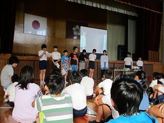 はじめに、1年生と4年生の代表児童による作文発表がありました。2人とも1学期を反省し、2学期にがんばることを堂々と発表していました。