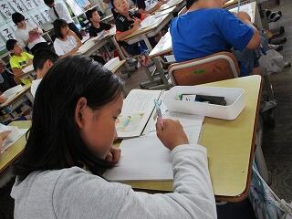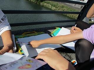 大瀬橋の上で、川の水の流れを見て確認し、川の流れや河原の様子をイラストや文にかきまとめました。理科の先生からの解説もきちんと聞きながら学習できておりました。