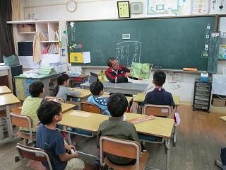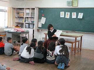 たくさん見に来た教室では、教材提示装置でテレビに写して読み聞かせを行いました。