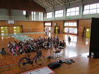 2校時に中学年へ、3校時に高学年へ、4校時に低学年へ指導していきました。今回も学校近くの自動車教習所の方々を講師に招いて指導してもらいました。今日は、天候があいにくの雨だったため体育館でDVDの動画を視聴した後、横断歩道の正しい渡り方を学習しました。