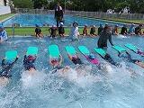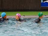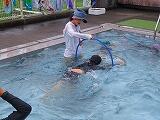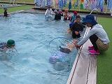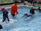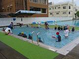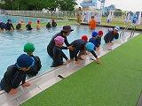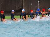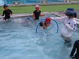 2年生の水遊びの様子です。プールを周回する形で輪くぐりの練習をしていました。みんな上手に潜ったり浮いたりしてくぐっていました。