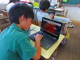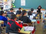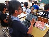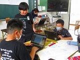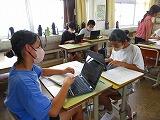6年生です。一人一台端末を使って、テーマに沿って調べグループでまとめて発表する準備をしていました。