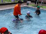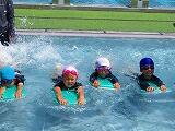 2年生の水遊びの様子です。始めたころに比べると随分上手になっています。ビート板を使ってバタ足や毛伸びからバタ足など水泳の学習を行っていました。みんな上手になっています。