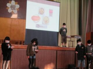 1月28日(火)朝、給食感謝集会が行われました。まず初めに、5・6年生の給食委員会による発表がありました。今回は、給食の配膳の仕方と食べ方のマナーについての発表でした。スライドを使っての発表の他、マナー違反の食べ方の実演など、工夫された発表でした。