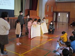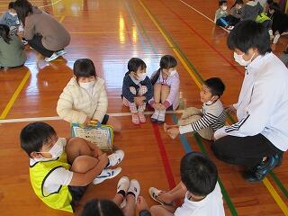 1月29日(水)2・3校時、1年生は体育館で校区内にある保育園の年長さんとの交流会を行いました。