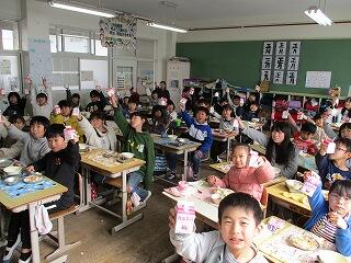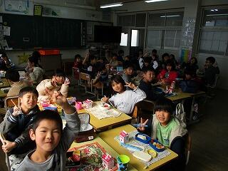 給食時間には、保健の先生の放送に合わせて、みんなで牛乳かんぱいをしました。