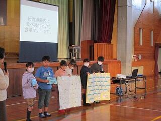 1月28日(火)朝、給食感謝集会が行われました。まず初めに、5・6年生の給食委員会による発表がありました。今回は、給食の配膳の仕方と食べ方のマナーについての発表でした。スライドを使っての発表の他、マナー違反の食べ方の実演など、工夫された発表でした。
