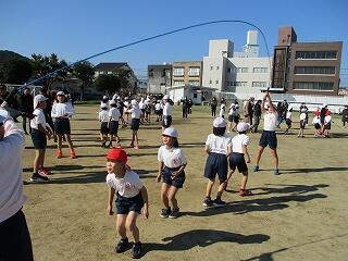 最後に、縦割り班に分かれて、学年の違う友だちと一緒にいろんな長縄のとび方をしながら楽しみました。