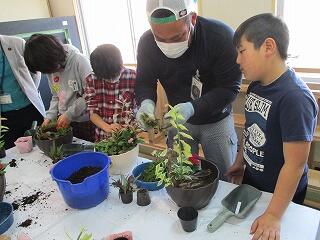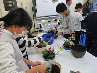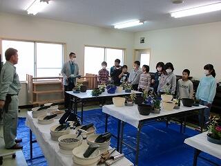 体育館のミーティングルームでは、園芸装飾に取り組みました。日本庭園等で使われる日本伝統の装飾技法を分かりやすく教えていただき、思い思いの園芸装飾を作り上げていきました。