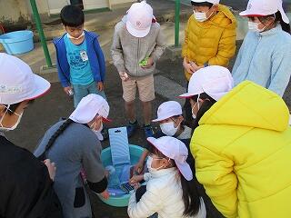 1月18日(土)、土曜授業のこの日、3年生は社会科学習の「昔の暮らし」を体験する目的で、ハンカチを手洗いしました。