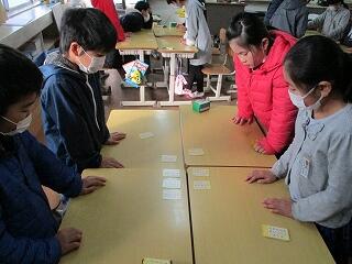 1月21日(火)2校時、4年教室から元気な声が響いてきました。気になって見に行ってみると、班ごとに百人一首の札を取り合っていました。