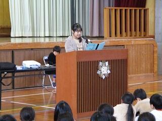 式の後、保健体育部の先生が1月の重点目標「いのちに感謝しよう」についての動画を見せ、身のまわりにはいろんな「いのち」があることに気付かせるとともに、「いのち」に感謝し、大切にしていこうという意識を高めるお話がありました。