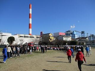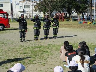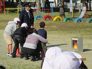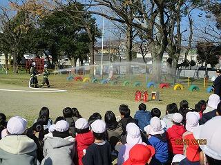 児童が運動場に避難した後、消防署の方々による消火のデモンストレーションを見学しました。