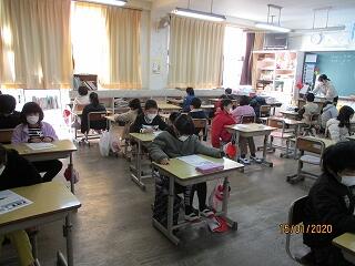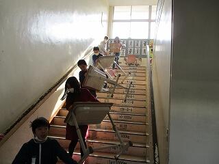 3学期よりエアコンの取り付け工事が行われております。昨日まで中校舎3階の4教室に取り付けをしておりました。15日(水)の午後より2階への取り付け工事が始まるため、昼休みに3・4年生が自分達の机・椅子移動を行いました。